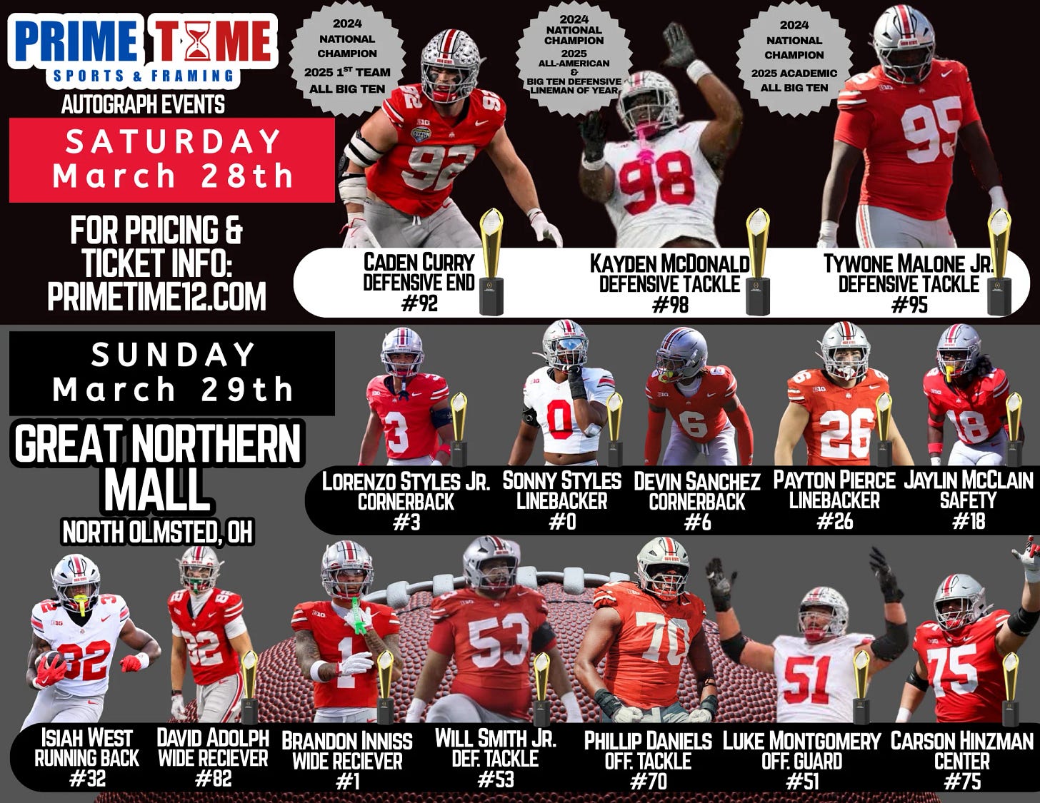 I don’t have a single item for you today, instead I have the chance to get your item signed by 15 former and current Buckeyes! On Saturday and Sunday at the Great Northern Mall in North Olmstead the following members of the 2025 team will be signing autographs: